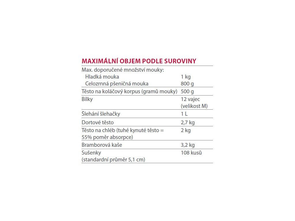 Základní příslušenství: 2 x nerezová mísa, plochý šlehač, plochý šlehač se stěrkou, hnětací hák, šlehací metla, nalévací štít.