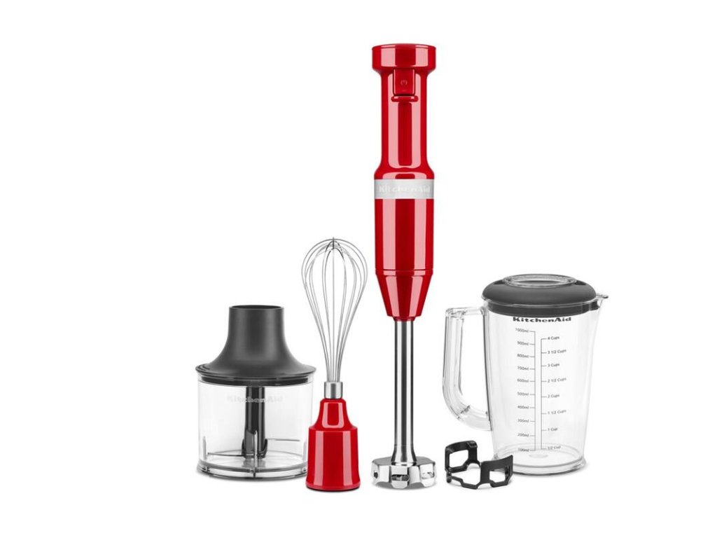 Ponorný mixér KitchenAid 5KHBV83EER za vás v kuchyni zastane spoustu náročné práce a ušetří vám čas. S jeho pomocí můžete nejen mixovat, ale také míchat, sekat, šlehat, drtit a pěnit. Během chvilky tak nadrtíte ořechy a našleháte lahodné pyré nebo smetanovou polévku. Zařízení má příkon 180 W, rychlost míchání lze plynule regulovat.
