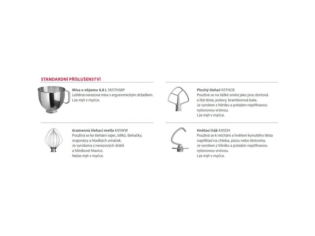 - 1x nerezová mísa o objemu 4,83 litru (K5THSBP) a to pro mixování až do hmotnosti 1,2 kg mouky (cca 2,25 kg těsta)